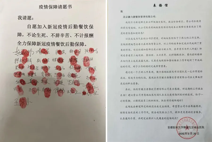 也正是從那一刻起,北京健力源餐飲管理有限公司員工開始了一場沒有硝煙的戰(zhàn)斗。健力源全體員工放棄與家人的團(tuán)聚,火速趕回工作崗位。并自愿簽署請愿書——“不論生死,不辭辛苦,不計報酬”,堅守在離病毒最近的地方。食堂承包